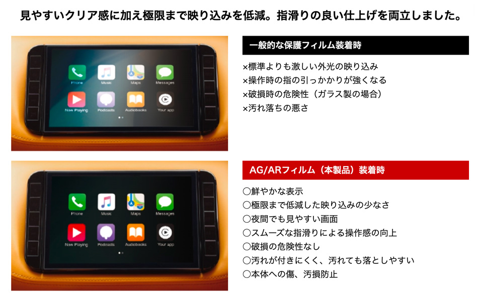 しかし、大画面、直接操作の弊害として直射日光や街路灯などの映り込みによる見えづらさや、操作することによりディスプレイ表面が汚れてしまうといった問題があります。ディーフはこうした環境下でのディスプレイを見やすく・使いやすくするための機能をフィルムに加え、自動車専用として時間をかけて開発を行いました。