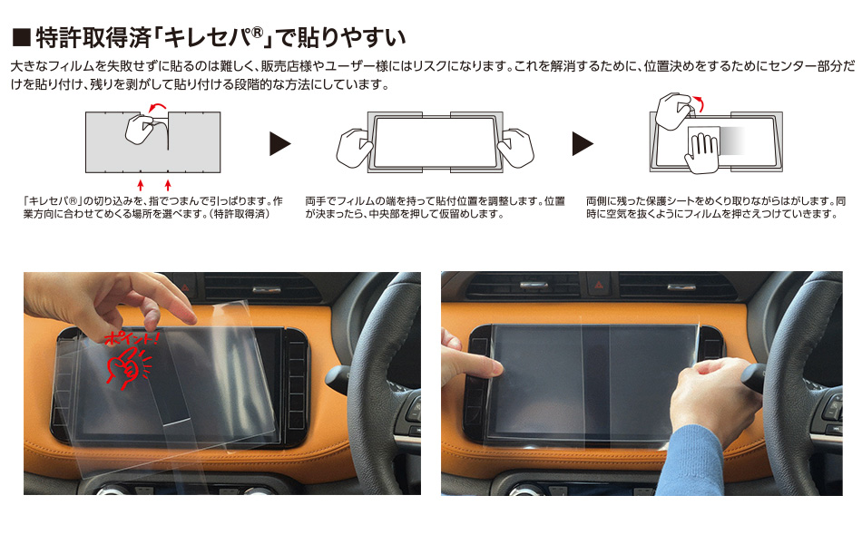 最近の車載用ディスプレイはサイズも大きく、設置場所も貼り付け作業もしづらいところになっています。本製品は貼りやすさも追求した結果、位置決めをしやすく貼りやすい特殊保護シート「キレセパ?」を採用しました。フィルムを貼り慣れていない人でも、位置を決めやすいので失敗がありません。特殊粘着剤は何度も貼り直しができるため、納得がいくまで位置調整できます。