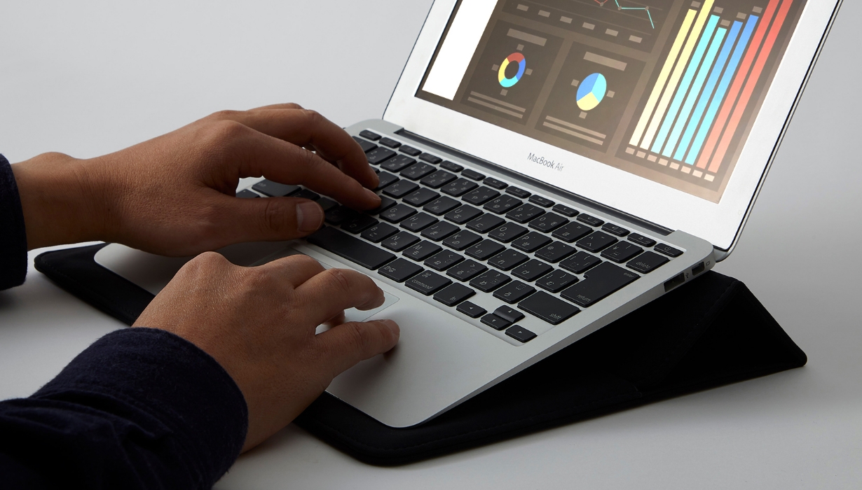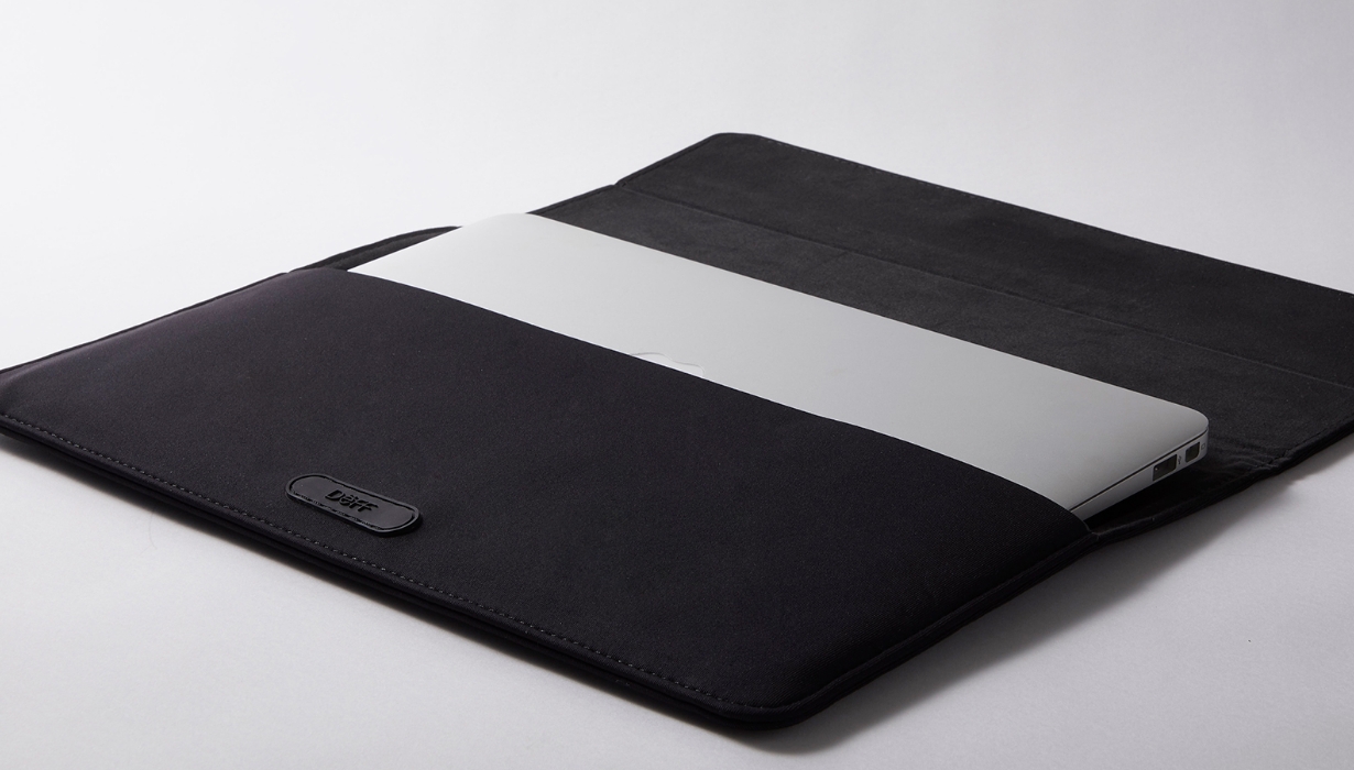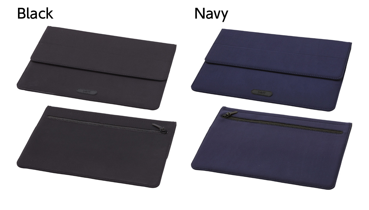 シンプルな封筒タイプの形状は、13インチクラスのノートPCやタブレットを収納できます。開閉部はフラップタイプでマグネットにより固定されます。主素材にはストレッチ素材のライクラ®ファイバー(※)を使用しています。