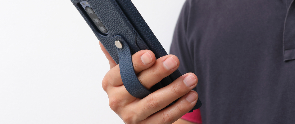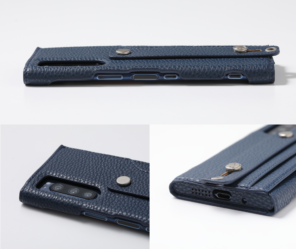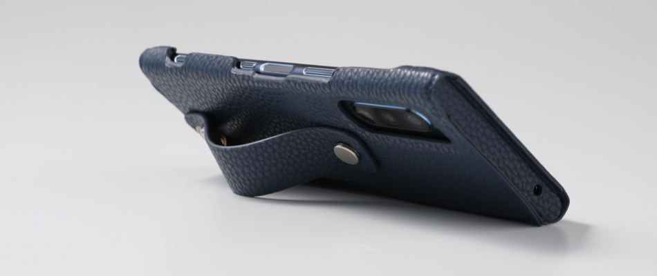背面にはカード類を収めるのに便利なユーティリティポケットがあります。また、指を入れ、しっかりと本体を持つことができるようになるベルトもあり、Xperia 5のボディをいつでも安心して使うことが可能。このベルトは固めなので、さらに引き出せばスマートフォンを横置きした際のスタンドにもなります。ベルトの端には大きなハトメがあるので、お気に入りのチャームやネックストラップを取り付けることもできます。