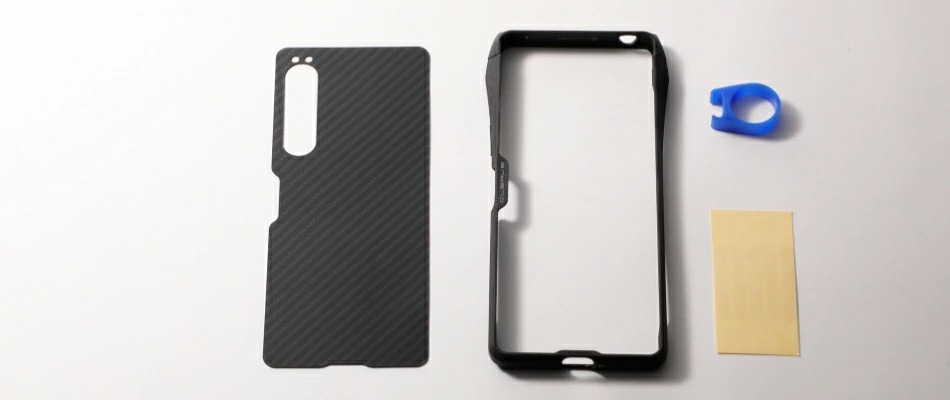 背面には、アラミド繊維製(デュポン社のケブラー)のシートを貼り付けられます。傷付きやすい背面を強固に保護するだけなく、カーボンファイバーを思わせる織目模様がオリジナルにはないソリッドでハードな印象へ変化させます。シートは容易に剥がれないよう、バンパーでガードされます。